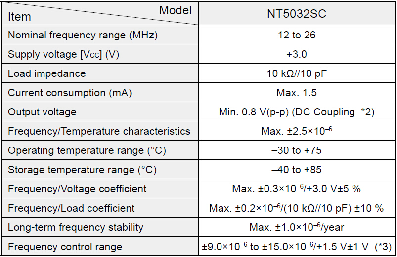 溫度補(bǔ)償晶振,NT5032SC有源晶振,NDK株式會(huì)社,為對(duì)應(yīng)低電源電壓的產(chǎn)品,(可對(duì)應(yīng)DC+2.4 V±0.1 V to +3.3 V±5 %),高度:最高1.5 mm、體積:0.022cm3、重量:0.06g,超小型、量輕,帶有AFC(頻率控制)功能,低消耗電流,表面貼片型產(chǎn)品,(可對(duì)應(yīng)回流焊)無(wú)鉛產(chǎn)品,滿足無(wú)鉛焊接的回流溫度曲線要求.