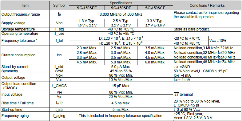 SPXO晶體振蕩器,SG-150SEE有源晶振,愛普生2016mm晶振,頻率范圍3.0MHz~54.0MHz,電源電壓1.8V~3.3V,功能使能(OE),外部尺寸規格2.1×1.7×0.75mm,滿足無鉛焊接的高溫回流溫度曲線要求,帶有AFC(頻率控制)功能,Enable/Disable功能,產品本身可根據使用需要進行選擇.