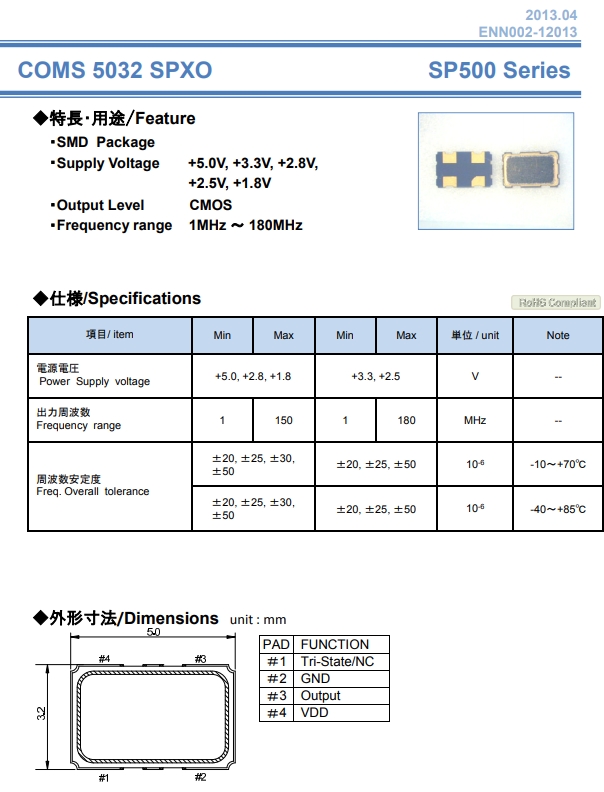 NAKA晶體,SPXO振蕩子,SP500晶振.小型表面貼片晶振型,是常用的NAKA晶振,適用于寬溫范圍的電子數(shù)碼產(chǎn)品,家電電器及MP3,MP4,播放器,單片機(jī)等領(lǐng)域.可對應(yīng)8.000MHz以上的頻率,在電子數(shù)碼產(chǎn)品,以及家電相關(guān)電器領(lǐng)域里面發(fā)揮優(yōu)良的電氣特性,滿足無鉛焊接的回流溫度曲線要求.