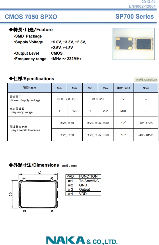NAKA晶振,crystal OSC,SP700納卡有源晶振.有源貼片石英晶振外觀使用金屬材料封裝的,具有高穩定性,高可靠性的石英晶體振蕩器,晶振外觀本身使用金屬封裝,充分的密封性能,可確保其高可靠性,采用編帶包裝,外包裝采用朔膠盤,可在自動貼片機上對應自動貼裝等優勢.
