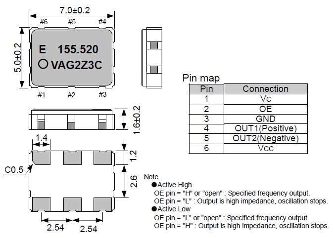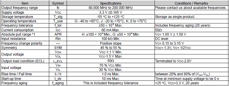 VG-4512CA石英晶體振蕩器,VCXO晶振,愛普生晶振,“VG-4512CA 155.5200M-GGCT0” 頻率范圍80MHz~200MHz,電源電壓3.3V,絕對頻率控制范圍50×10-6, 100×10-6,功能使能(OE)Active High or Low,外部尺寸規格7.0×5.0×1.6mm,輸出LV-PECL.