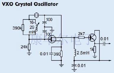 該電路中的晶體直接連接在晶體管的基極和地之間.由于晶體管的內部電容,電容器C1用于改善反饋.該電容器應盡可能靠近晶體管安裝.晶體管集電極中的LC儲能電路被調諧到晶體的泛音頻率.發射極電阻電容器在工作頻率下必須具有大約90Ω的容抗.電感器L1上的抽頭用于匹配晶體管集電極的阻抗.通常,此抽頭的位置距離線圈冷端約三分之一.陷阱的放置是在穩定性和最大功率輸出之間的權衡.輸出信號取自鏈接耦合線圈L2,并通過變壓器作用進行工作.