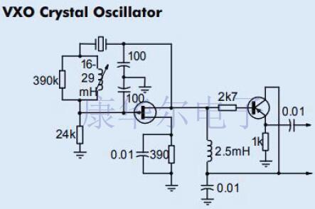 該電路使用6MHz或8MHz晶體提供穩定的VCXO晶振.通過使用電容器和電感器可以實現串聯諧振任一側的頻率牽引.