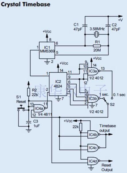 板載振蕩器和17級分頻器組成IC1.如圖所示,通過連接標準的3.58MHz電視色同步晶體,可在IC輸出的引腳1上產生60Hz方波的精確信號源.然后將這些脈沖饋入4024七級波紋計數器IC2.它的輸出直接連接到IC3中的不同門,IC3是雙四輸入NAND門.根據脈沖選擇開關S2占據哪個位置,這些門之一將提供選定寬度的輸出/復位脈沖. 使用不同的電路設計制造出來的振蕩器性能,功能,應用,封裝尺寸都不一樣,現在也有越來越多的新型電路出現,康華爾電子后續會再為大家總結一些相關的信息.還想了解哪方面的晶振知識,可以到http://m.tuanchewang.com/官網上留言,我們竭誠為廣大新老客戶服務.