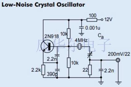 在該電路中,電阻器R1和R2使NAND門的溫度穩定,并確保門處于線性區域以進行啟動.電容器C1是一個DC塊,并且在工作頻率下必須具有<0.1Ω的阻抗.晶體以串聯模式運行,因此其串聯電阻低很重要.1MHz至10MHz范圍內的AT切割晶體工作良好,占空比接近50%,上升時間受芯片限制.電路可在0℃至70℃的溫度范圍內良好啟動. 低噪聲晶體振蕩器